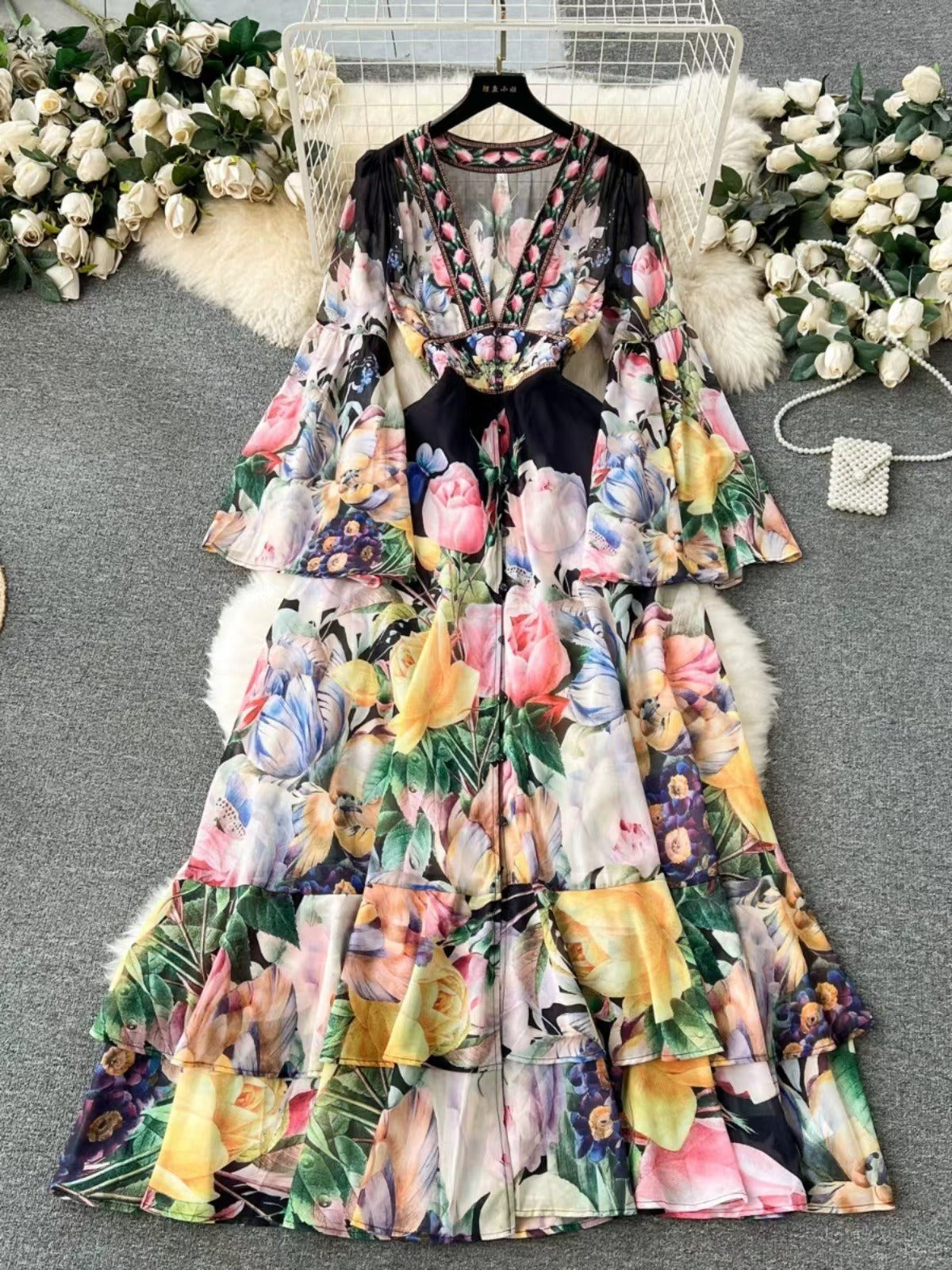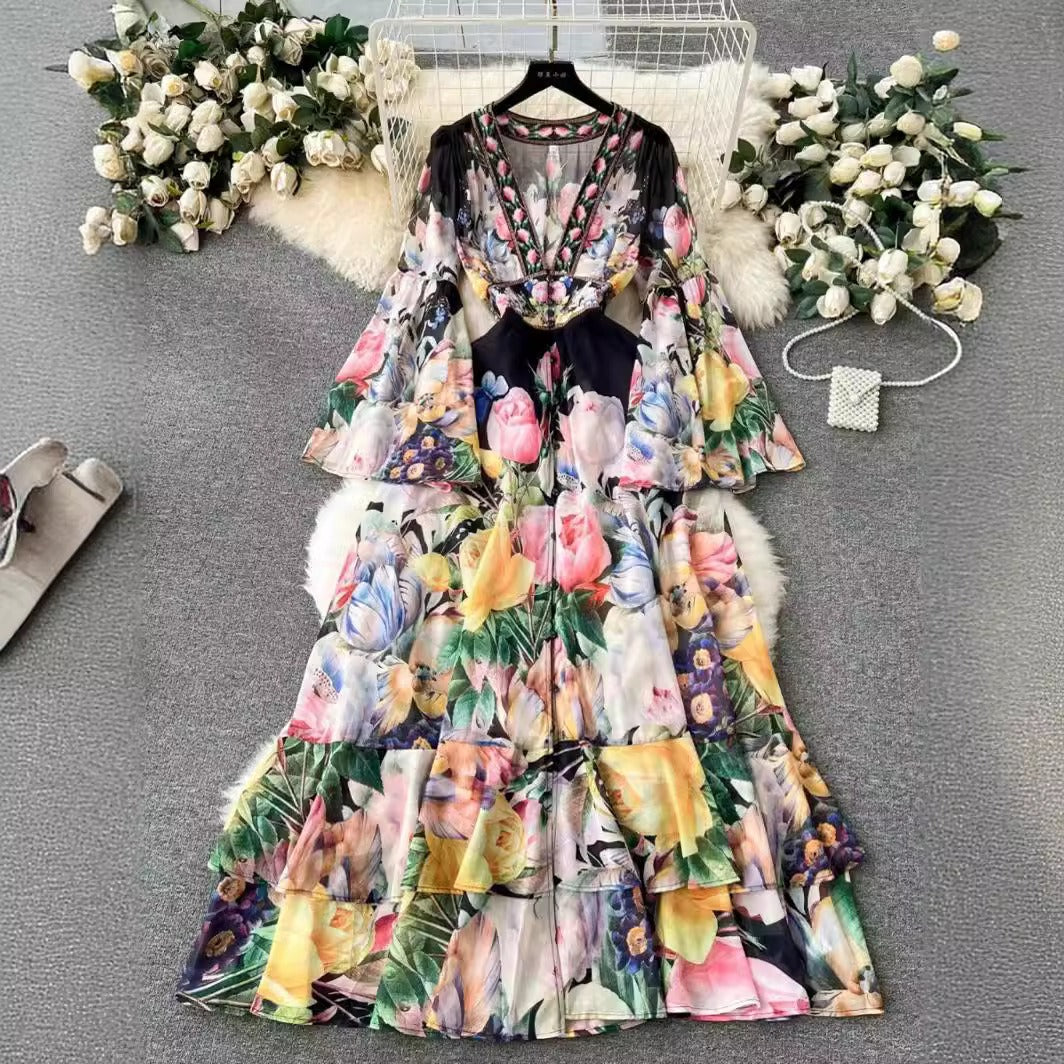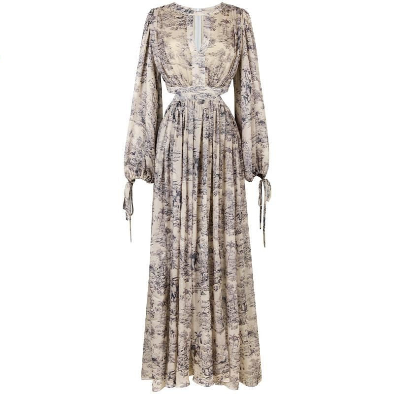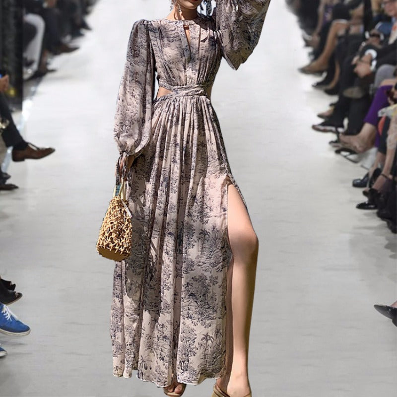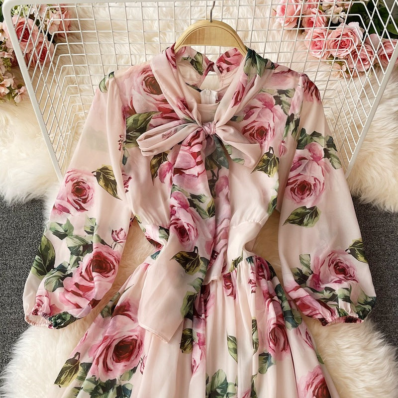 Elegante abito lungo in chiffon stile palazzo francese con stampa vintage | ULZZANG BELLA